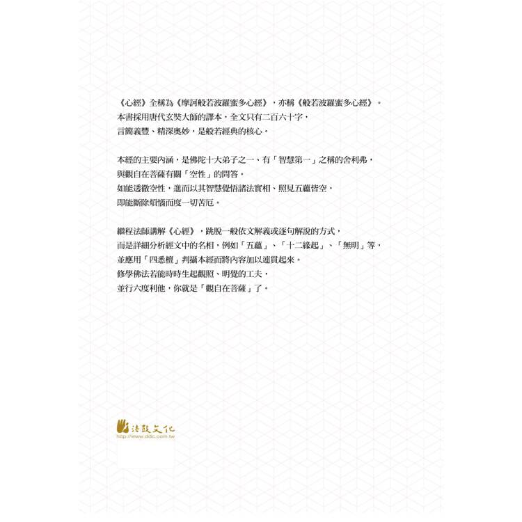 繼程法師講解《心經》,跳脫一般依文解義或逐句解說的方式,而是詳細分析經文中的名相,例如「五蘊」、「十二緣起」、「無明」等,並應用「四悉檀」判攝本經而將內容加以連貫起來。修學佛法若能時時生起觀照、明覺的工夫,並行六度利他,你就是「觀自在菩薩」了。