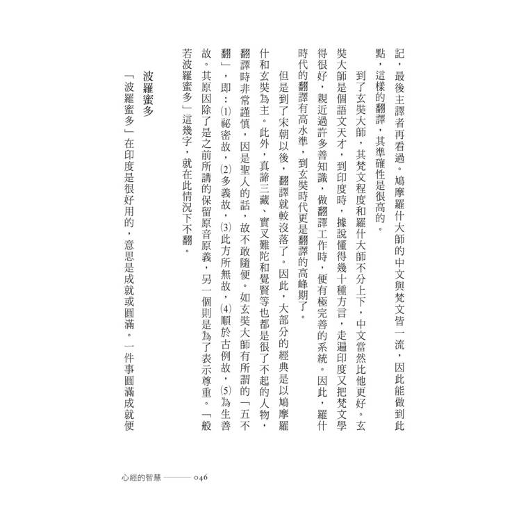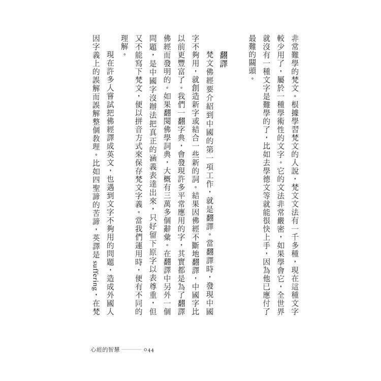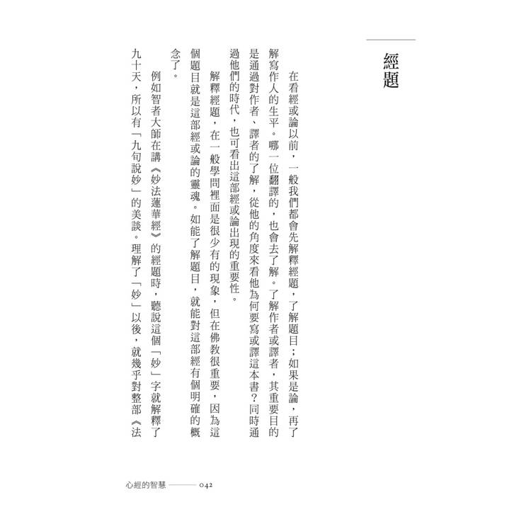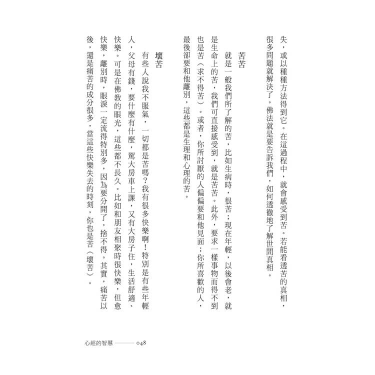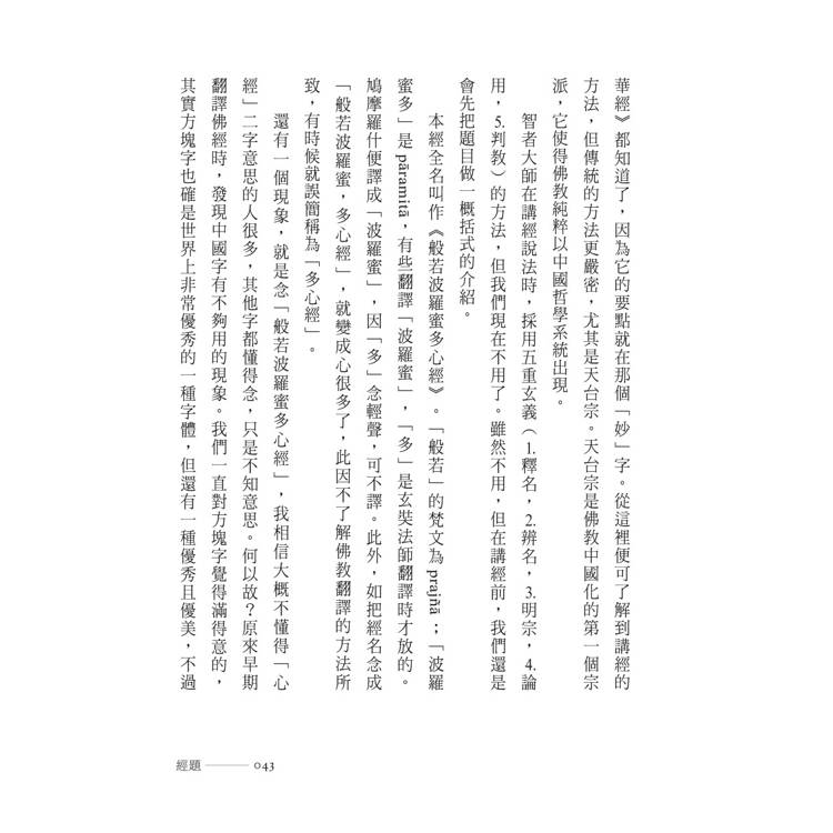 翻譯╱波羅蜜多╱苦╱苦苦╱壞苦╱行苦╱般若.智慧.知識╱六度╱布施╱持戒╱忍辱╱精進╱禪定╱六度相互配合,般若領導五度╱三種般若╱文字般若╱觀照般若╱實相般若╱三慧——聞、思、修╱聞所成慧╱思所成慧╱修所成慧╱戒.定.慧╱現證慧╱世俗智與勝義智╱《心經》╱三心╱中心與全部╱經與論╱律╱內容豐富的《大藏經》╱解題╱《心經》的譯本