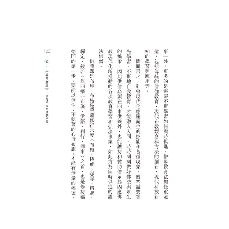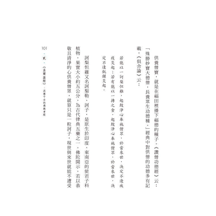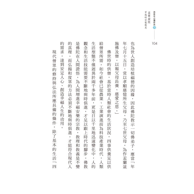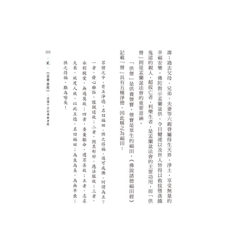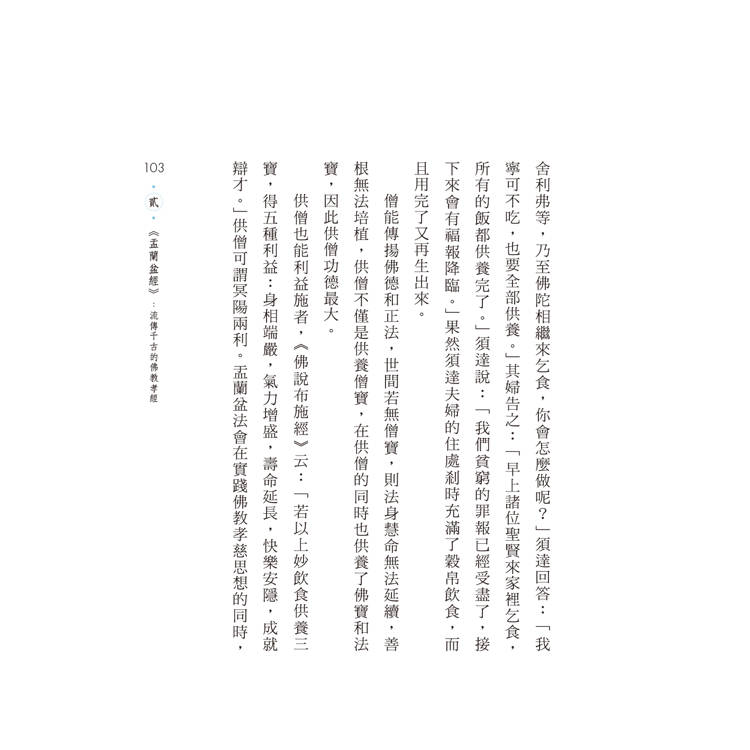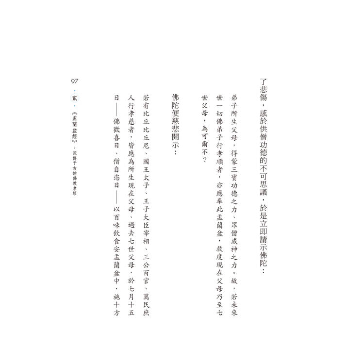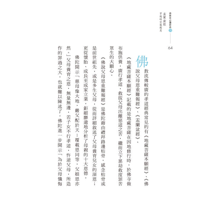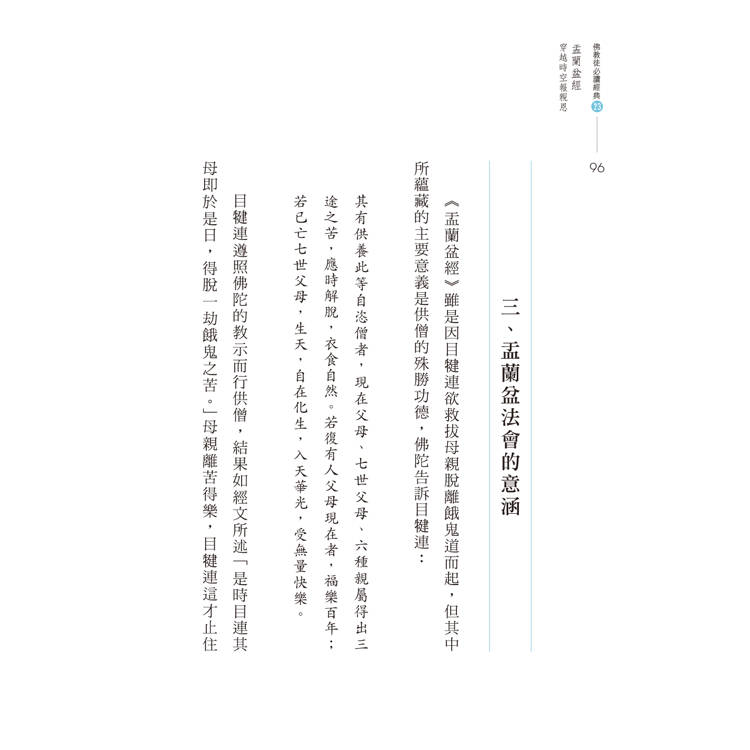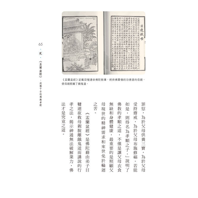 百善孝為先,孝道是人倫的根本,這也是目連救母故事流傳千古的主要原因。《盂蘭盆經》文字簡短卻廣受推崇,不但深刻影響中國文化,豐富了宗教史、戲曲史、藝術史、民俗學等,也流傳到日、韓、越南等地,足見其影響力。本書作者除針對《盂蘭盆經》做介紹,又引歷史文化做為見證,期能啟發世人的孝心,在實踐佛法的過程中,與佛接心。