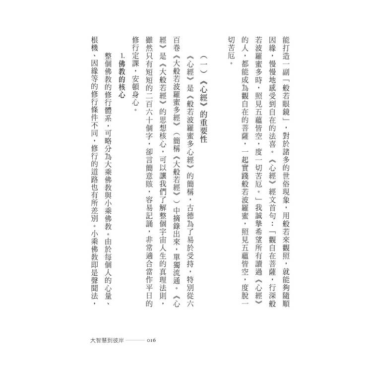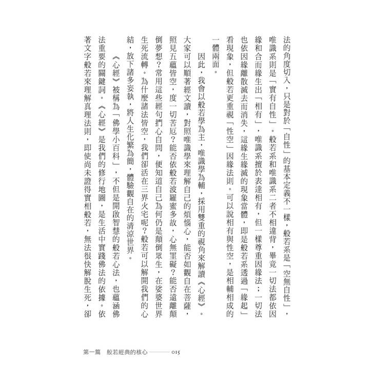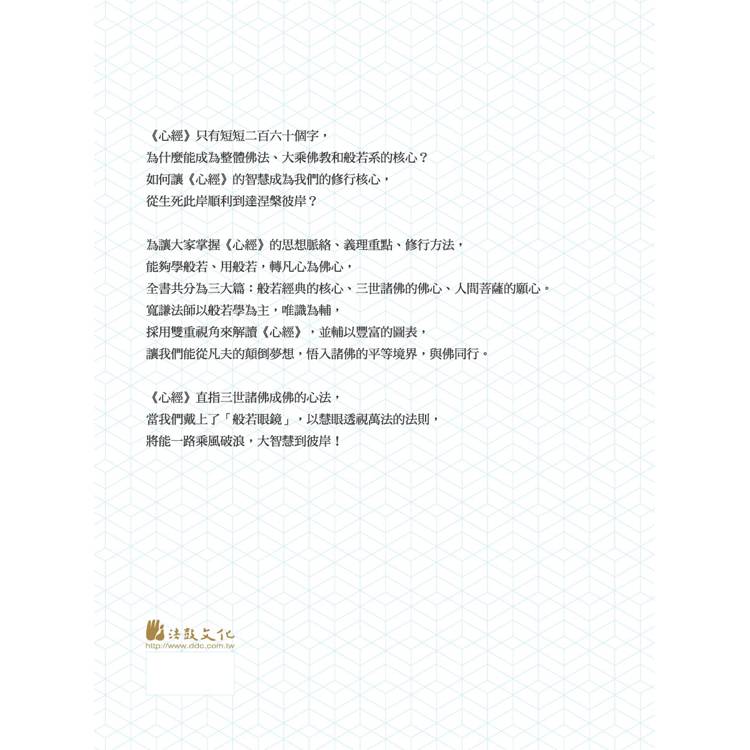 《心經》被稱為「佛學小百科」,不但是開啟智慧的般若心法,也蘊涵佛法重要的關鍵詞。《心經》是我們的修行地圖,是生活中實踐佛法的依據。依著文字般若來理解真理法則,即使尚未證得實相般若,無法很快解脫生死,卻能打造一副「般若眼鏡」,對於諸多的世俗現象,用般若來觀照,就能夠隨順因緣,慢慢地感受到自在的法喜。《心經》經文首句:「觀自在菩薩,行深般若波羅蜜多時,照見五蘊皆空,度一切苦厄。」我誠摯希望所有讀過《心經》的人,都能成為觀自在的菩薩,一起實踐般若波羅蜜,照見五蘊皆空,度脫一切苦厄。(摘錄)