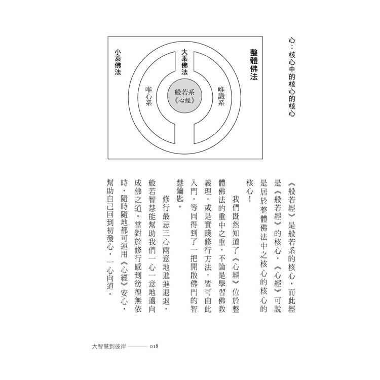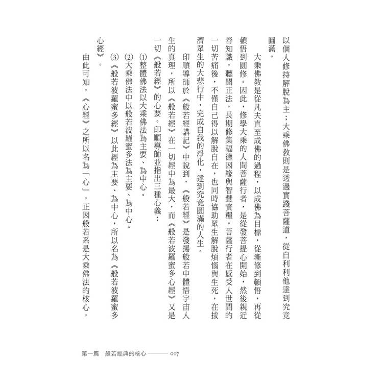 本書共分為三篇,第一篇〈般若經典的核心〉,除闡明《心經》的重要性,說明《心經》為何是般若經典的核心,並介紹般若思想特質和萬法法則,讓人能以慧眼看世界。第二篇〈三世諸佛的佛心〉,正明《心經》法義,三世諸佛皆依般若波羅蜜多成佛,運用印順導師的科判表解說《心經》結構,並輔以多張圖表逐句解析《心經》義理心髓。如能依般若轉凡心為佛心,將可圓滿般若波羅蜜多成佛之道。第三篇〈人間菩薩的願心〉,認識三大阿僧祇劫的修行歷程,將能掌握實踐《心經》的方法,成就人間菩薩大願行。
