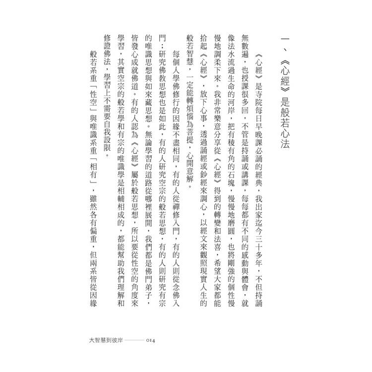 《心經》是般若心法 《心經》是寺院每日早晚課必誦的經典,我出家迄今三十多年,不但持誦無數遍,也授課很多回,不管是持誦或講課,每每都有不同的感動與體會,就像法水流過生命的河岸,把有稜有角的石塊,慢慢地磨圓,也將剛強的個性慢慢地調柔下來。我非常樂意分享從《心經》得到的轉變和法喜,希望大家都能拾起《心經》,放下心事,透過誦經或鈔經來調心,以經文來觀照現實人生的般若智慧,一定能轉煩惱為菩提,心開意解。