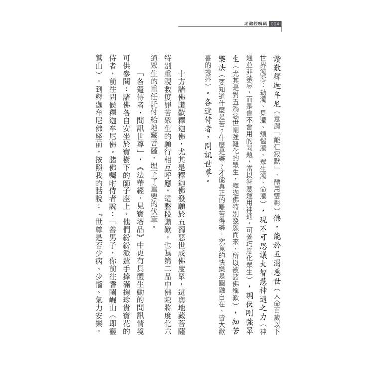 此書透過學術專業的知識推廣佛學,展現出智信而非迷信的精神。以理性邏輯剖析經典的契理層面,並結合生活中的信仰實踐來體解經文的契機情境,發掘出其內在蘊涵的契理契機的深遠意義。閱讀本書,不僅有助於加深對《地藏經》的智慧領會,更能培養更為穩固而深切的信心。
