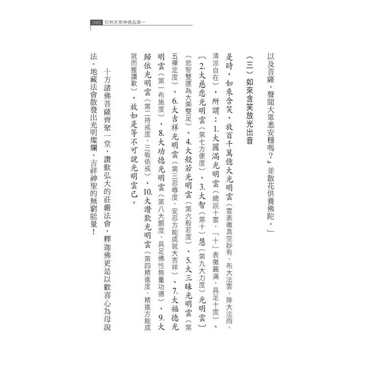 佛經具有契理契機的特質,其經文情境中蘊藏深意,耐人尋味,值得我們反覆揣摩與深入思考。以《地藏經》為例,各品出場的人物角色,如文殊菩薩、地藏菩薩、摩耶夫人、定自在王菩薩、四天王、普賢菩薩、普廣菩薩、大辯長者、閻羅王、諸鬼王、堅牢地神、觀音菩薩、虛空藏菩薩,他們各自的身分具體代表了什麼特殊意義?此外,經文中出現的法數,例如十種光明雲、十佛名號功德,或是迴向他人七分之六功德自得、迴向自家三生受樂,以及捨一得萬報、三十二種頂光、二十八種利益等細節,是否隱含著特定的數字密碼?地藏菩薩的十方化身齊聚忉利法會,最終又合而為一的情節背後,其實傳遞了什麼樣的教法?