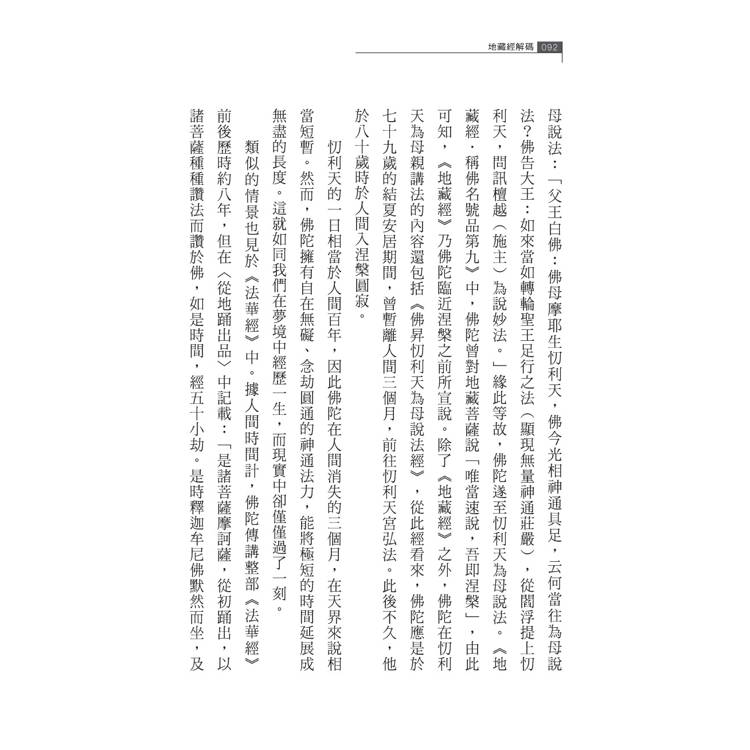 本書透過將《地藏經》與《華嚴經》對照解讀,並運用華嚴宗十分殊勝的解經方法以闡發《地藏經》隱含的法義。華嚴宗按照修行的次第「信、解、行、證」,梳理與詮釋《華嚴經》的整體脈絡,並經常運用「託事顯法」的方式,從經文中的具體事物、名稱及數字中揭示深層的法義。李老師對這些解經方式非常熟稔,因此能洞見《地藏經》中蘊藏的諸多精妙法義,開啟前人未曾發揮的說法。本書名為《地藏經解碼:開啟生死智慧》,確實是名副其實,內容深具說服力。