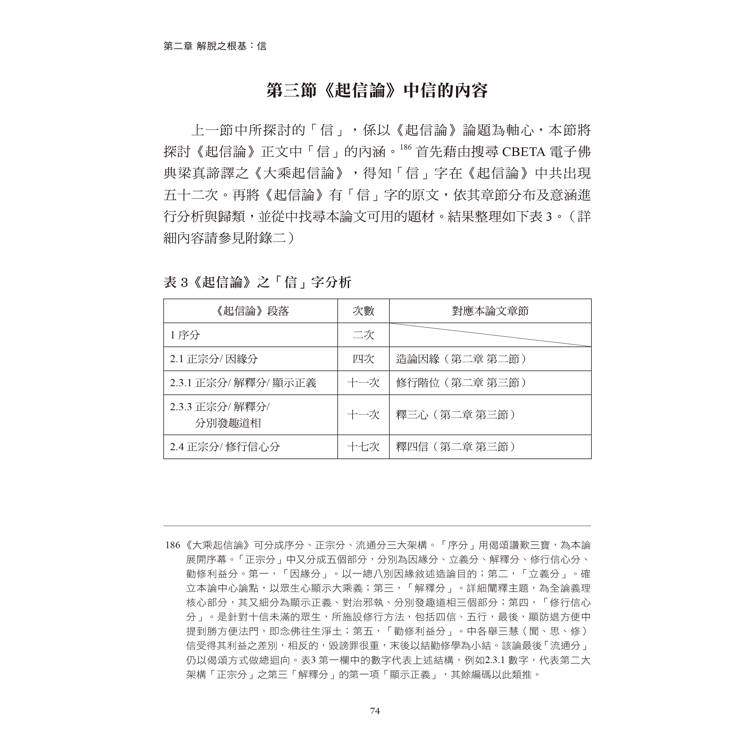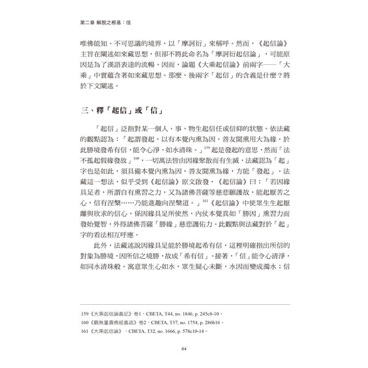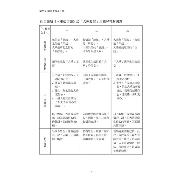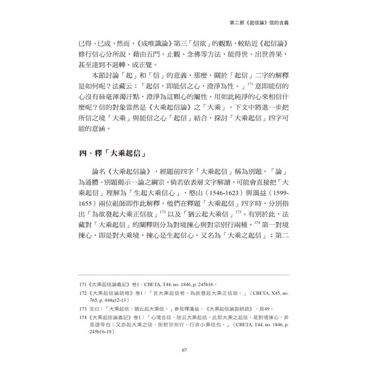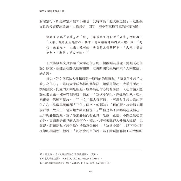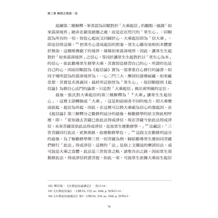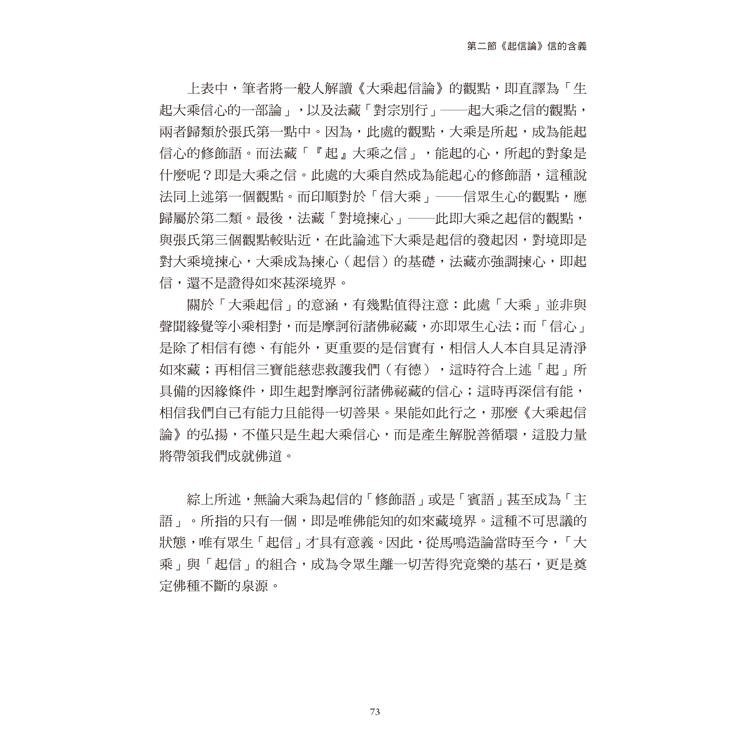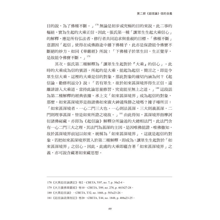 《大乘起信論》是一部講述中國佛教心性思想的論書,目的是激起眾生對修行能成佛有信心。《《大乘起信論》信、覺、行之研究》內容採取歷史分析法,回到原始佛教、部派佛教及印度與中國大乘佛教中去探源。作者提出信、覺、行三種架構的結合,萃取出《起信論》之精髓,是適合現代人閱讀的大乘解脫指南。