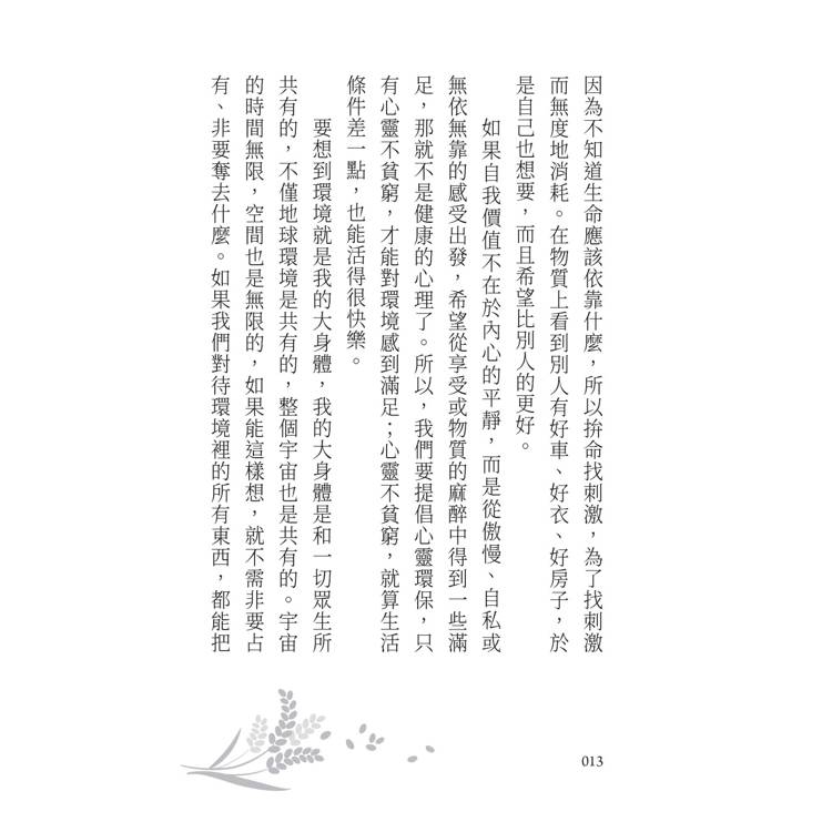 我曾提出:「需要的不多,想要的很多」這兩句話,「想要」是貪欲的煩惱,「需要」只是生存的最低條件;「想要」的可以不要,「需要」的不是問題。禪修的人因為內心不會感到空虛不安,欲望必定減少,就能「少欲知足,知足常樂」了。