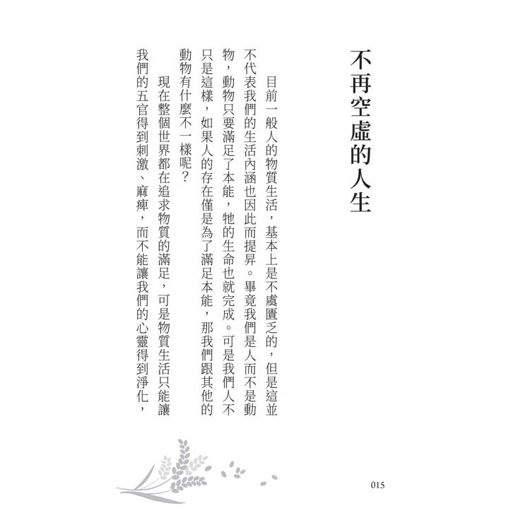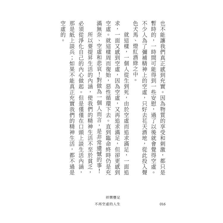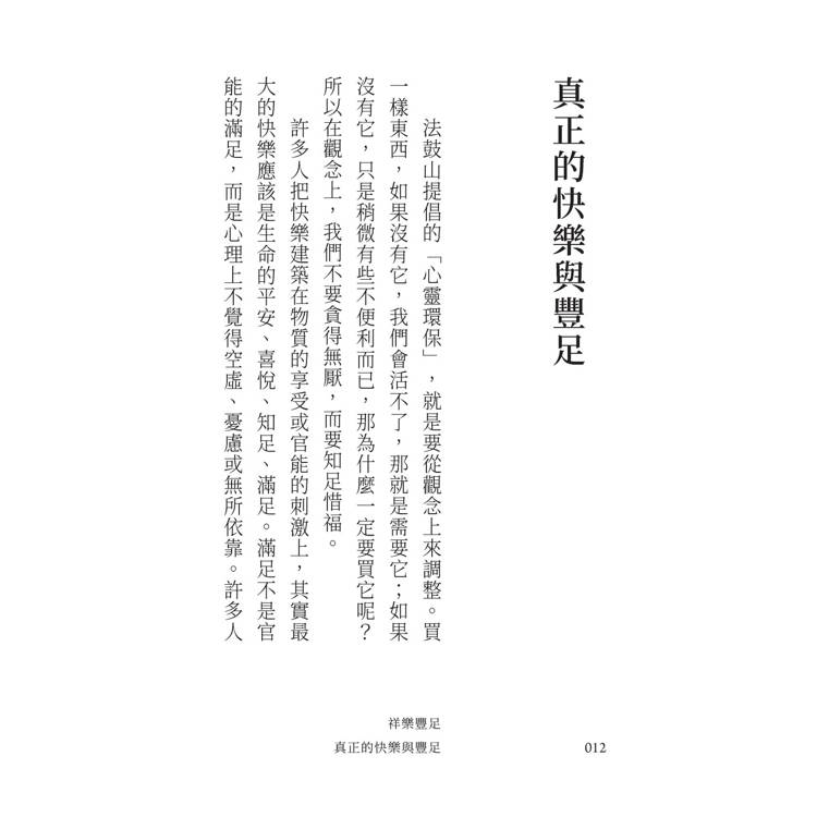 聖嚴法師告訴我們,真正的快樂與豐足,其實應該由內心做起。當心靈豐足了,生活自然豐足!一位練習禪修的人,能夠把心安住於當下;心能夠安定,自然容易屏除外在的干擾,進而感受到生活中時時刻刻的滿足與充實。