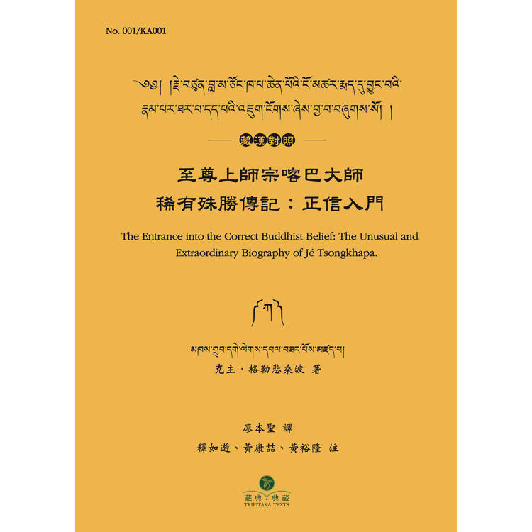 「至尊宗喀巴大師文集」總共十九函,共175部著作(總代號為Nos. 001‒175),木刻本有塔爾寺本、拉卜楞札希奇寺本、札什倫布寺本、拉薩雪本、德格大寺本等五個版本,而以塔爾寺本(簡稱塔本)為主。另依南印度哲蚌寺出版的校勘本,其中引自「甘珠爾」(佛語的藏譯)及「丹珠爾」(論典的藏譯)的經論,多半會附上「中华大藏经(藏文部分)對勘本」(簡稱dPe bsdur ma)的卷號、頁碼及行碼,有助於正確解讀。 其中第ཀ་(KA)函(即第1函)共有14部著作(總代號Nos. 001‒014/各函代號KA001‒KA014),本書是其中的第一部No. 001/KA001《至尊上師宗喀巴大師稀有殊勝傳記:正信入門》。 一、內容概述 克主傑大師(1385‒1438)撰寫的這部No. 001/KA001《至尊上師宗喀巴大師稀有殊勝傳記:正信入門》(簡稱《正信入門》),相對於克主傑大師的另一部著作No. 003/KA003《傑仁波切如海密傳中完整敘述少分之言論:寶穗》而言,前者被稱為《共傳》或《共通傳記》,而後者被稱為《密傳》或《不共傳記》;換言之,克主傑大師的這兩部著作能相互補充。其次,No. 001/KA001《至尊上師宗喀巴大師稀有殊勝傳記:正信入門》的相關描述,可以多滇.蔣悲嘉措(1356–1428)撰寫的No. 002/KA002《至尊上師宗喀巴大師廣傳別錄:傳記嘉言總集》作為不同面向的輔助。而《正信入門》中提及的傳承上師及著作,建議配合宗喀巴大師的No. 008/KA008《傑仁波切羅桑察貝悲之聞法錄》閱讀,相信能看出更清晰的輪廓與細節。《正信入門》共分六章,擇要概述如下: 〈第一章 圓滿敘述年少階段的次第分期第一〉 這個時期是描述宗喀巴大師年紀1歲(1357)至6歲(1362)期間的事蹟。此章克主傑大師以「大士」(བདག་ཉིད་ཆེན་པོ་)之名稱呼宗喀巴大師,敘述大師誕生之地、父母的種姓與世系血統、大師的長相及天性。在7歲以前即從法主第四世噶瑪巴.若佩多傑接受優婆塞律儀(居士律儀),取名為「貢噶寧波」。將近7歲時,由法主屯珠仁欽賜予金剛乘灌頂,取密號為「屯越多傑」。