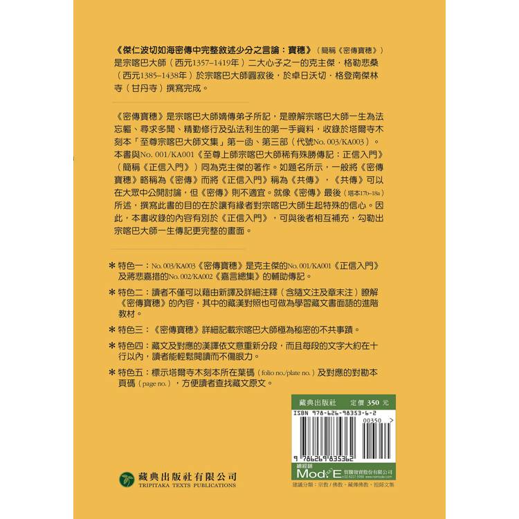 ✻特色二:讀者不僅可以藉由新譯及詳細注釋(含隨文注及章末注)瞭解《密傳寶穗》的內容,其中的藏漢對照也可做為學習藏文書面語的進階教材。