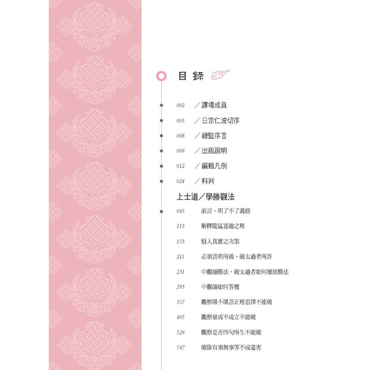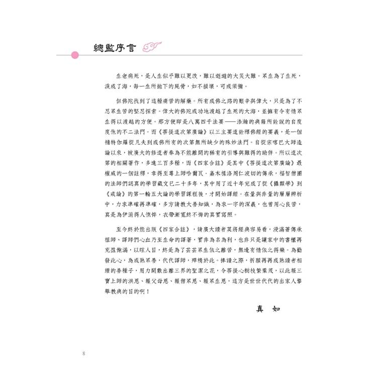 故《菩提道次第廣論四家合註白話校註集6?毗缽舍那》(上)一書的出版,是日常老和尚、真如老師的重大心願。希望藉此獻給所有志求菩提道的人們,善巧駕馭寂止奢摩他的駿馬,手持中觀正見的鋒利寶劍,出征輪迴之城,摧破一切邊執所執境,奔赴那無死空性的光明國城!