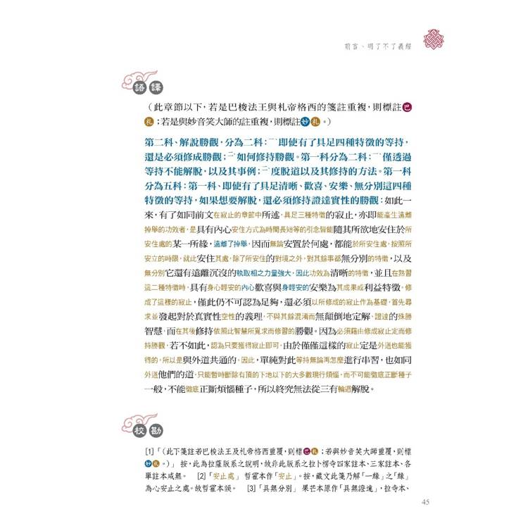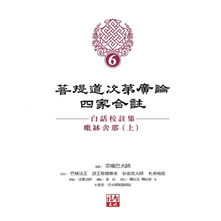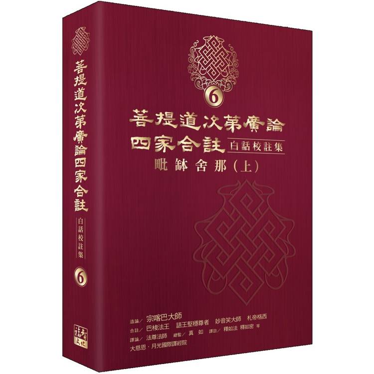 如今在眾多善緣匯聚下,大慈恩.月光國際譯經院已圓滿《菩提道次第廣論四家合註白話校註集6?毗缽舍那》(上) 的翻譯和註解。針對《廣論》原文部分,譯經院依據《法尊法師文集》所收錄之法尊法師於1948年重新修改《廣論?毗缽舍那》章的譯文,同時參照各種版本的藏文原典,進行詳細校訂。並且將原文及箋註重新翻譯為白話文,冀使現今的讀者,讀起來倍感親切,藉此細細聞習祖師著作中的密意。