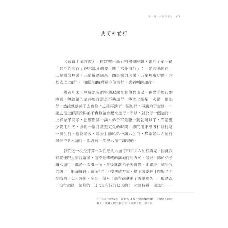 《普賢上師言教》(佐欽熙日森五明佛學院譯)羅列了第一篇「共同外前行」的六部分綱要,叫「六外前行」:一是暇滿難得,二是壽命無常,三是輪迴過患,四是業力因果,五是解脫功德,六是依止上師。下面詳細解釋這六個前行,或者叫前加行。