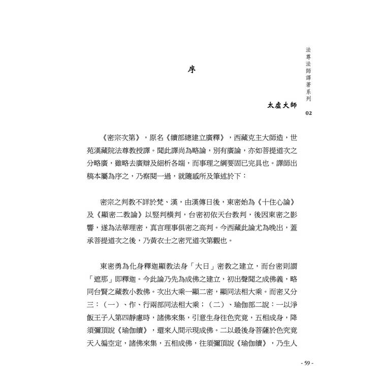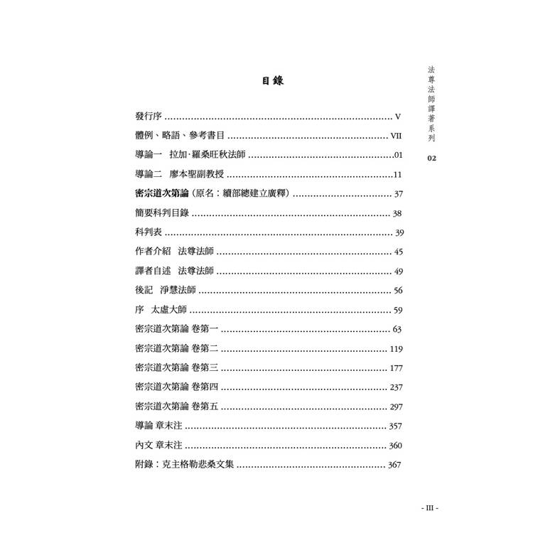 本書的中譯科判採仿宋體,引文採標楷體,其餘行文採新細明體。其次,藏文內文以字級為8的圓括號及內含的數字(正面為a,背面為b),標示塔爾寺版(TBRC Vol. No. 706, W23693)的木刻本葉碼(folio no./plate no.)。另以字級為8的方括號及內含的數字,標示南印度哲蚌寺出版「宗喀巴大師父子三尊文集」對勘本的頁碼(page no.)。法尊法師的中譯也附上字級為8的圓括號及內含的數字,以及字級為8的方括號及內含的數字,依序標示中譯對應於木刻本與對勘本的所在位置。法尊法師在〈本書譯例〉提及需灌頂才能聽聞的部分,法師採略譯或未譯,廖本聖老師下注標記未譯的起迄藏文。其次,根據「法尊法師全集」第四冊,字級為12的圓括號及內含文字為法尊法師所附加。字級為12的方括號及內含文字,則是廖本聖老師依藏文補闕的文字。