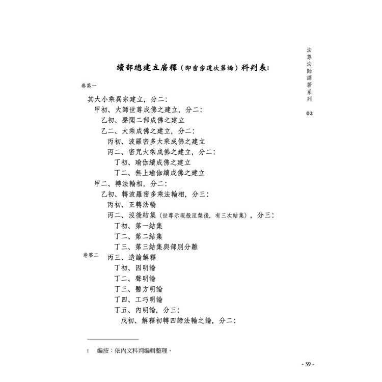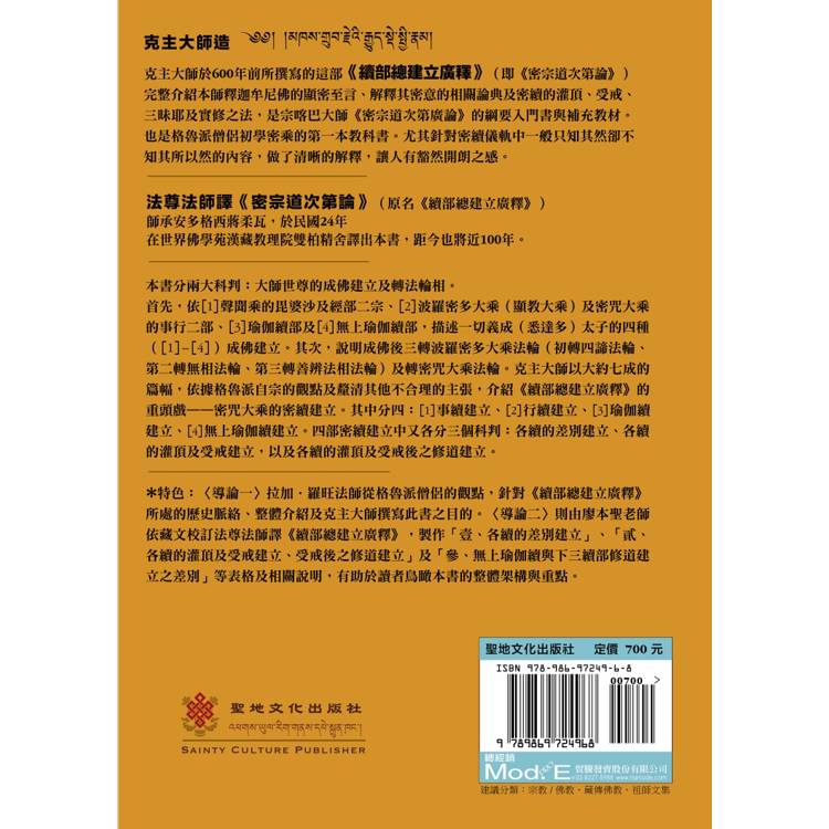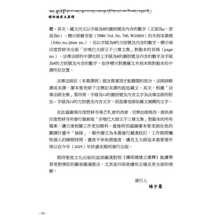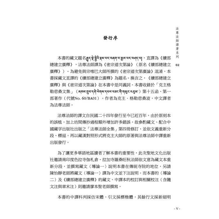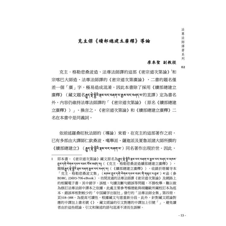 為了讓更多華語地區讀者了解本書的重要性,此次聖地文化出版社邀請印度色拉寺、拉加寺羅桑旺秋法師依文意為藏文本重新分段,並撰寫藏文〈導論一〉說明本書在傳統寺院的地位,另請陳怡靜老師將藏文〈導論一〉譯為中文並下注說明。而本書的〈導論二〉及《續部總建立廣釋》的藏文、中譯本的校訂與相關校注(含隨文注與章末注)則邀請廖本聖老師撰寫。