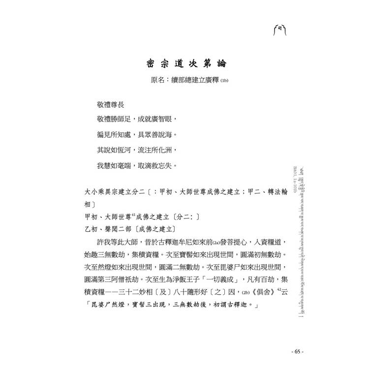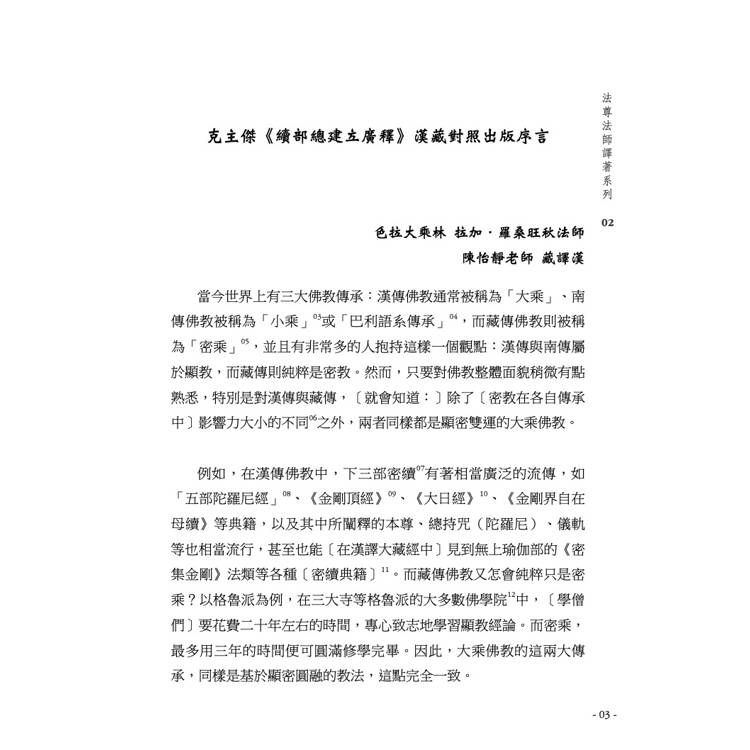 ✻特色二:讀者不僅可以藉由新譯及注釋(含隨文注及章末注)瞭解《續部總建立廣釋》的內容,其中的藏漢對照也可做為學習藏文書面語的進階教材。