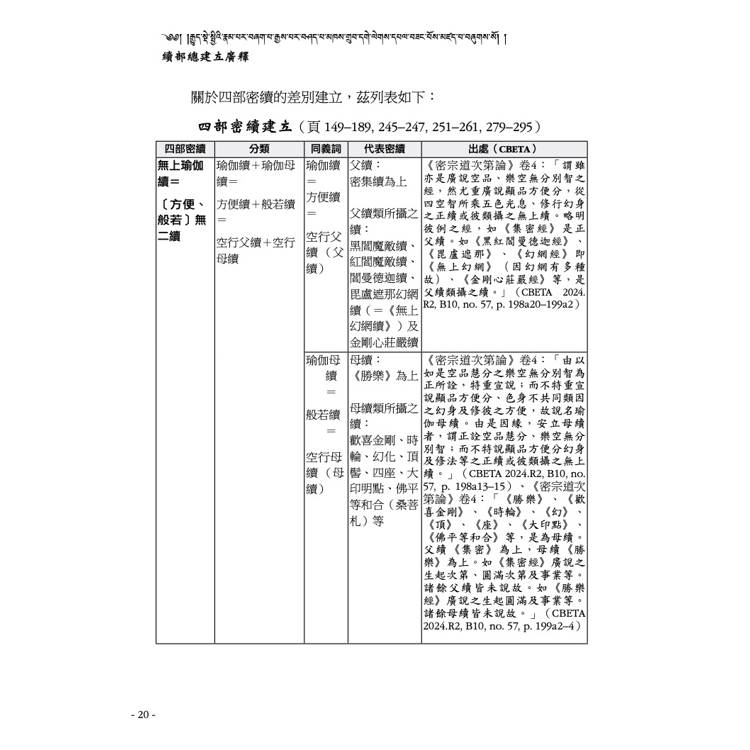 接著,克主大師以大約七成的篇幅,依據格魯派自宗的觀點及釐清其他不合理的主張,介紹《續部總建立廣釋》的重頭戲——密咒大乘的密續建立。其中分四:[1]事續建立、[2]行續建立、[3]瑜伽續建立、[4]無上瑜伽續建立。四部密續建立中又各分三個科判:各續的差別建立、各續的灌頂及受戒建立,以及各續的灌頂及受戒後之修道建立。