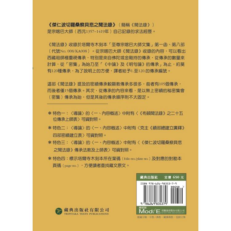 ✻特色三:〈導論〉的〈一、內容概述〉中附有〈《傑仁波切羅桑察貝悲之聞法錄》傳承法教及上師表〉可資對照。
