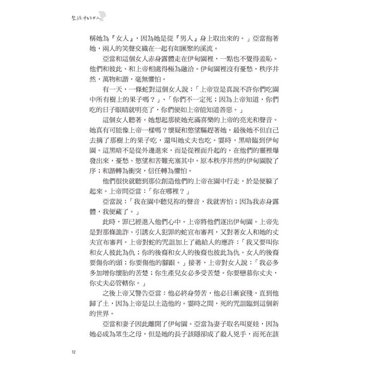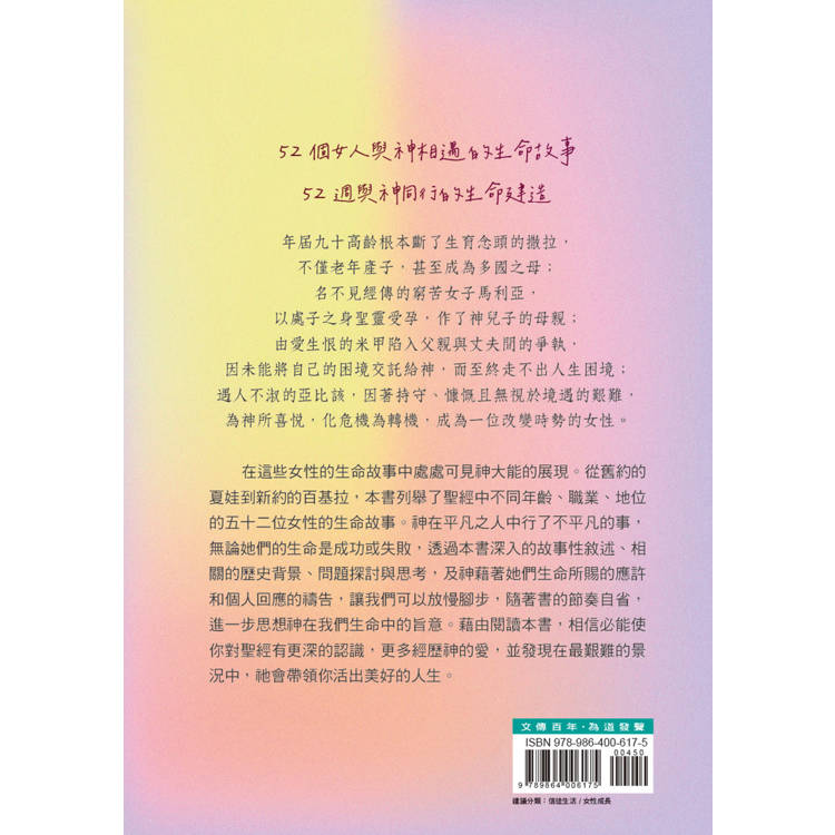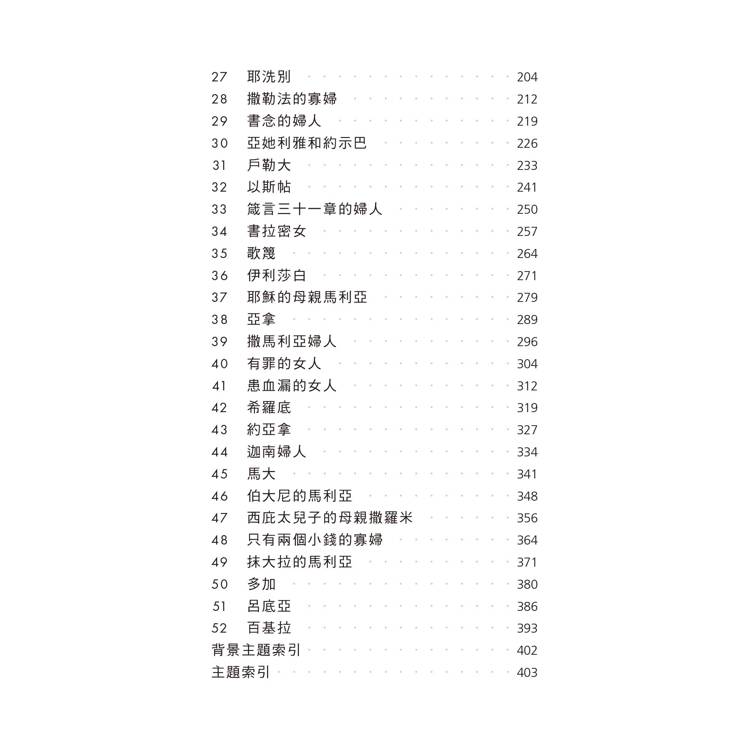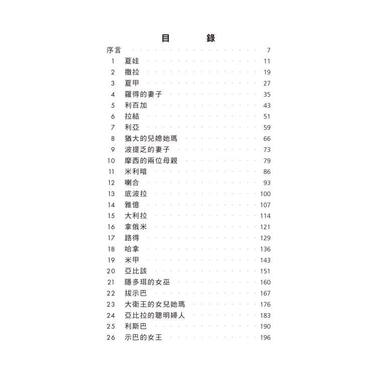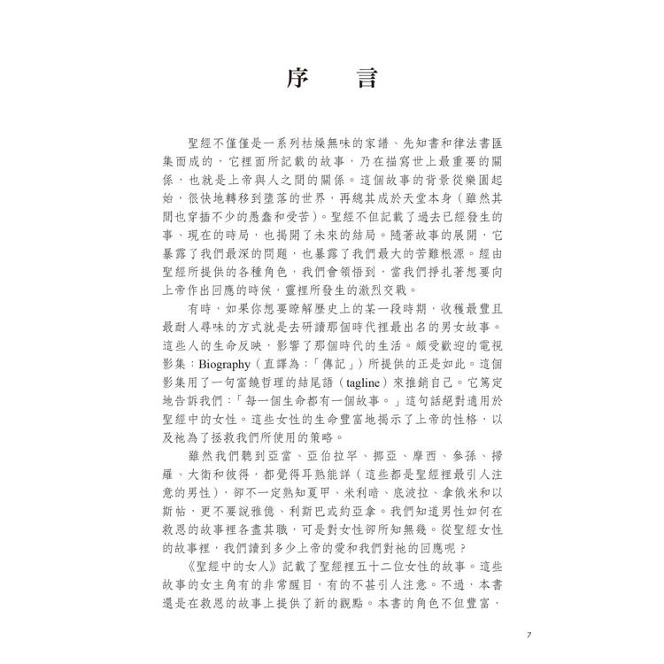 《聖經中的女人》記載了聖經裡五十二位女性的故事。這些故事的女主角有的非常醒目,有的不甚引人注意。不過,本書還是在救恩的故事上提供了新的觀點。