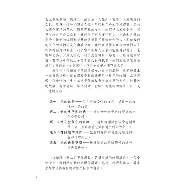 為了使各位讀者了解這些婦女故事中的真諦,我們發展出一套靈修課程。這套課程會幫助讀者用一整年的時間,每週思考一位女性的一生。每週靈修都包含五個主要的部分:啟發性的故事、背景資料、經文研讀、聖經中的應許和禱告。這個獨一無二的靈修課程,是用五天的時間專注在一位女性身上,我們希望藉此激勵你閱讀、思想、精研和禱告,尋求聖經中這些醒目的女性所扮演的角色。