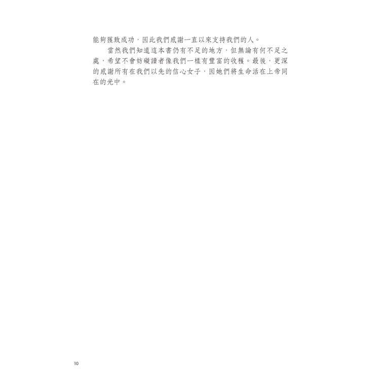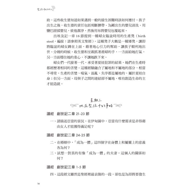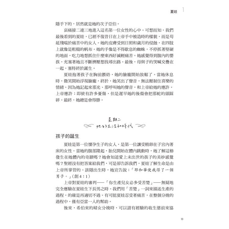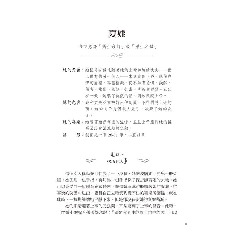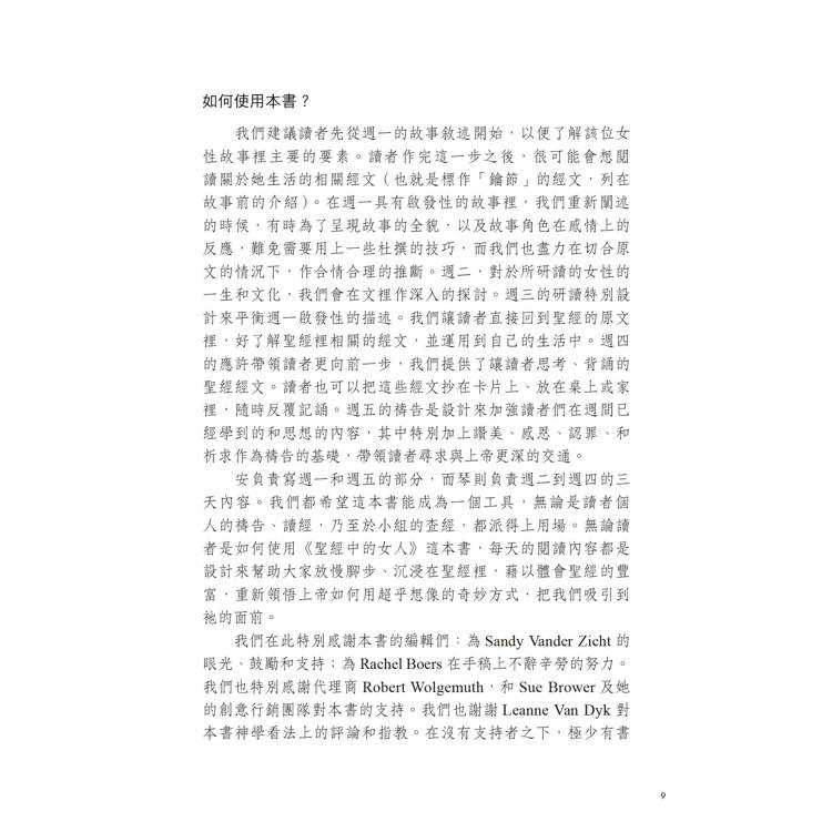 2. 無論讀者是如何使用《聖經中的女人》這本書,每天的閱讀內容都是設計來幫助大家放慢腳步、沉浸在聖經裡,藉以體會聖經的豐富,重新領悟上帝如何用超乎想像的奇妙方式,把我們吸引到祂的面前。