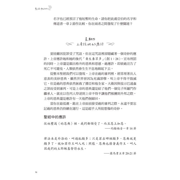 週四的應許帶領讀者更向前一步,我們提供了讓讀者思考、背誦的聖經經文。讀者也可以把這些經文抄在卡片上、放在桌上或家裡,隨時反覆記誦。