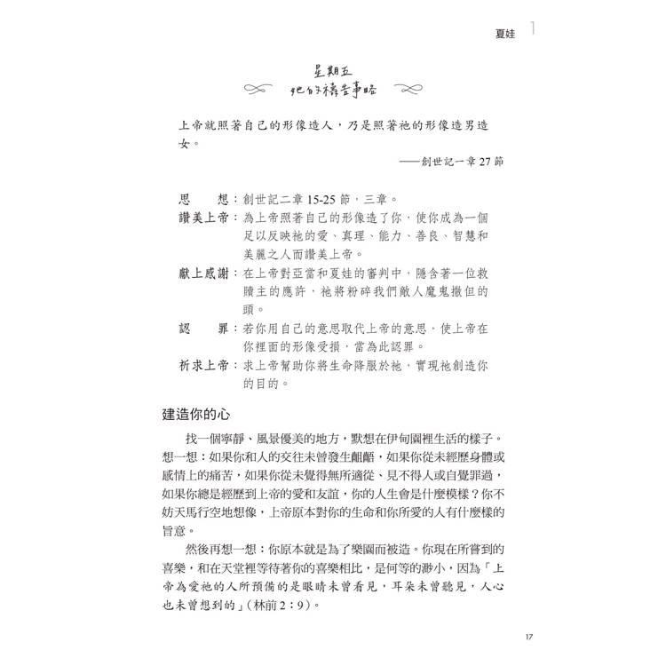 找一個寧靜、風景優美的地方,默想在伊甸園裡生活的樣子。想一想:如果你和人的交往未曾發生齟齬,如果你從未經歷身體或感情上的痛苦,如果你從未覺得無所適從、見不得人或自覺罪過,如果你總是經歷到上帝的愛和友誼,你的人生會是什麼模樣?你不妨天馬行空地想像,上帝原本對你的生命和你所愛的人有什麼樣的旨意。