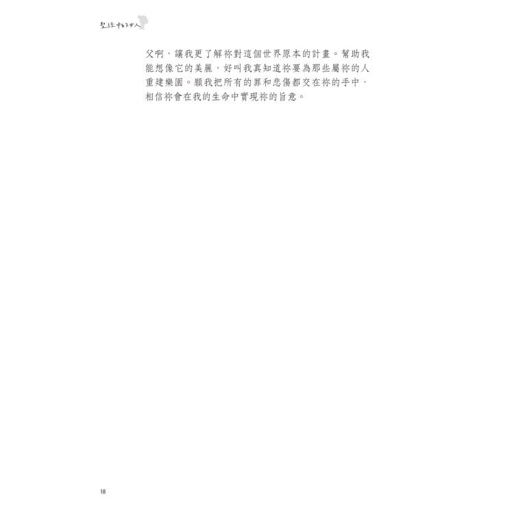 父啊,讓我更了解祢對這個世界原本的計畫。幫助我能想像它的美麗,好叫我真知道祢要為那些屬祢的人重建樂園。願我把所有的罪和悲傷都交在祢的手中, 相信祢會在我的生命中實現祢的旨意。