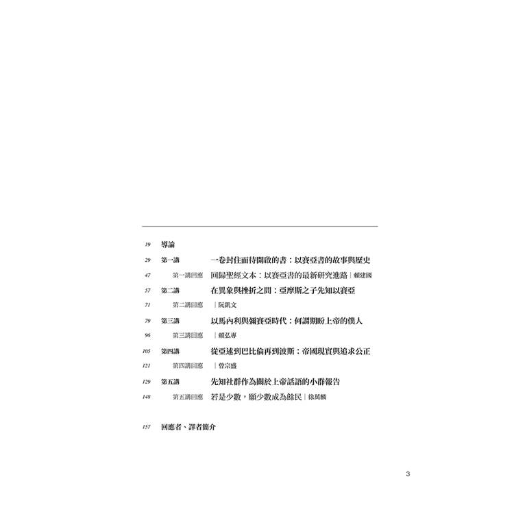 舒勒教授在第一講裡主張以賽亞書是一卷「封住而待開啟的書」,因為在寫作與編輯的每一階段都能以新的處境來重新解讀舊的以賽亞書並呈現新眼光,在新舊信息的交織與批判中帶出拯救的意涵,並邀請新的解讀;在第二講裡,他指出先知以賽亞的嘗試是一種「冒著風險的神學」,不隨從主流的聲音,且冒著可能犯錯的風險,對當時的當權者提出建言;第三講聚焦「上主的僕人」,並點出以賽亞的傳承者原本將盼望全然投注在居魯士身上,但之後認知到這位波斯帝王的限制,因而重新倡議「僕人彌賽亞」將以卑微、受苦的方式參與世人的苦難,並傳達上主的拯救與公義;第四講剖析從亞述到巴比倫再到波斯的帝國現實,強調在公正、公義之外也需要「救恩」的面向;在第五講裡,舒勒教授認為先知群體是以「小群」的身分自居,且從底層的角度呼籲「新以色列」應回歸公正與團結一體的價值,並以持守上主的約而非血統來建構新的信仰群體。