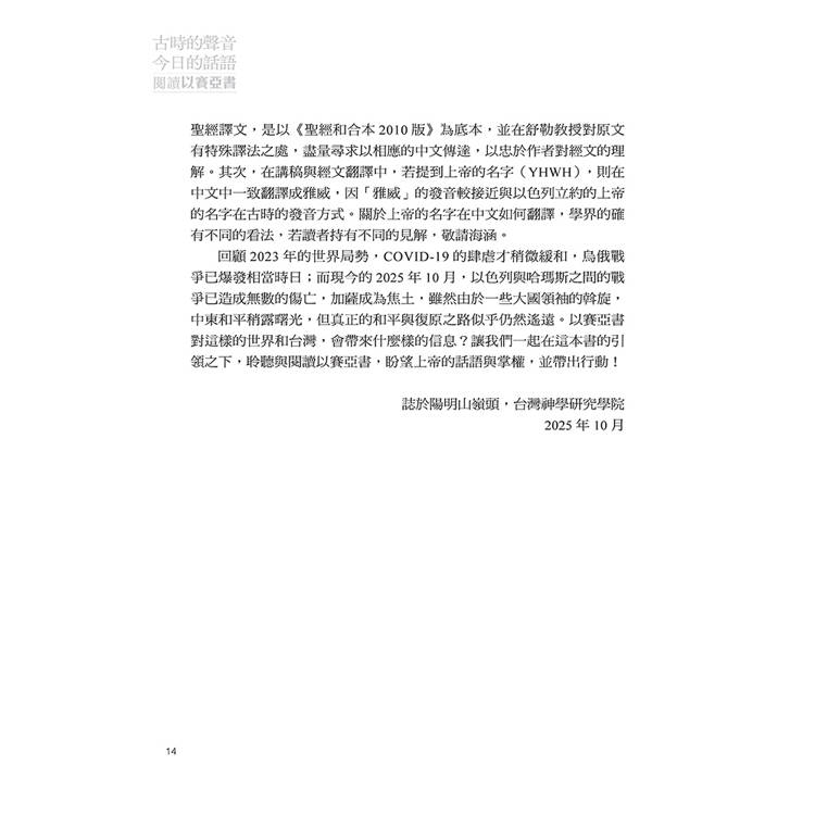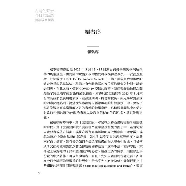 德國萊比錫大學舊約教授安德烈亞斯・舒勒於2023年3月前來台灣神學研究學院擔任馬偕講座的講師,內容極為豐富精闢,引發與會者的熱烈迴響。如今,經過台神同工細心地翻譯、整理、編輯,講座內容以《古時的聲音,今日的話語——閱讀以賽亞書》為題出版成書,真是可喜可賀,相信必能造就且裨益眾多讀者。