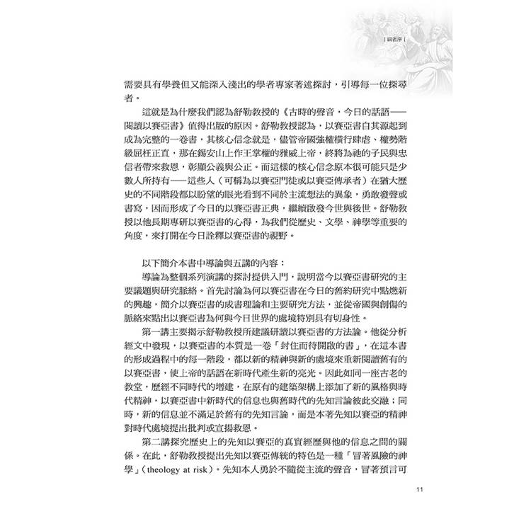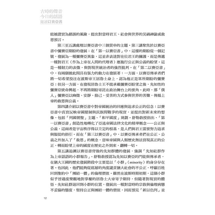本書《古時的聲音,今日的話語—閱讀以賽亞書》(A Voice from the Past, A Word for Today: Reading the Book of Isaiah)收集了萊比錫大學神學院安德烈亞斯.舒勒(Andreas Schuele)教授的五篇演講內容及各講的回應文,編輯成書。它探討的內容主題涵蓋以賽亞書的成書歷史、先知的故事、上帝的僕人、公平正義的議題,以及先知傳承的團體等五個主題。這些主題幫助讀者認識先知的信息,如何在不同時代處境(包括「第一以賽亞」、「第二以賽亞」以及「第三以賽亞」)中呈現出多樣而豐富的面貌。