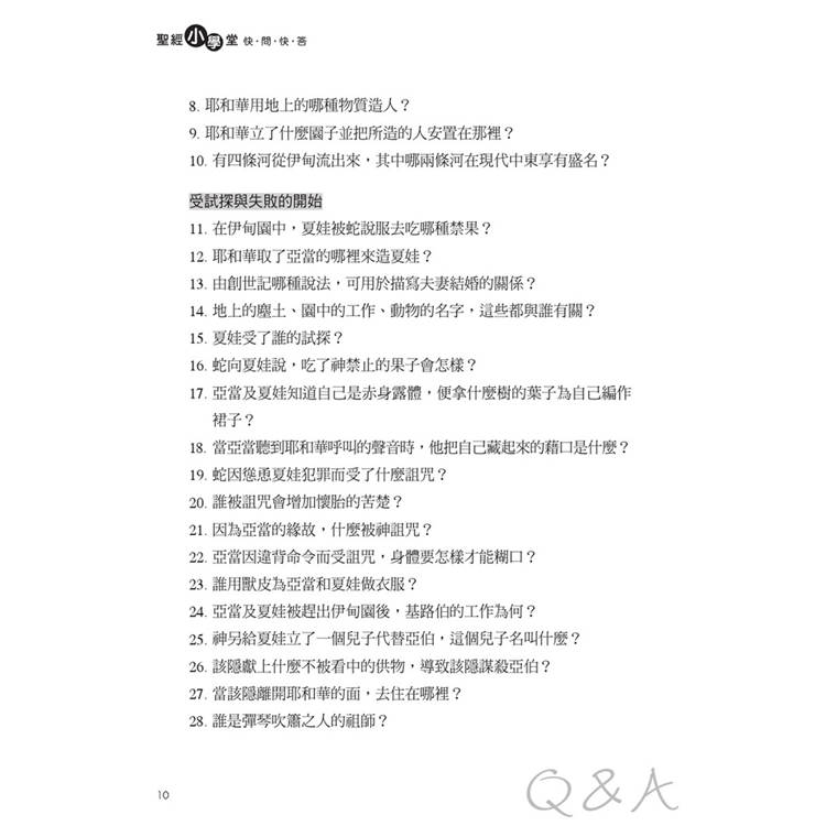 內容涵蓋約2,000多題聖經新舊約的常識問答,可以增加讀經樂趣,測試聖經熟悉度,發掘聖經事實,聚會、旅行、證道、團體遊戲都可使用。