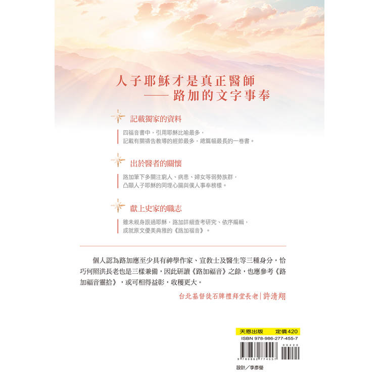 ◎個人認為路加應至少具有神學作家、宣教士及醫生等三種身分,恰巧何照洪長老也是三樣兼備,因此研讀《路加福音》之餘,也應參考《路加福音靈拾》,或可相得益彰,收穫更大。