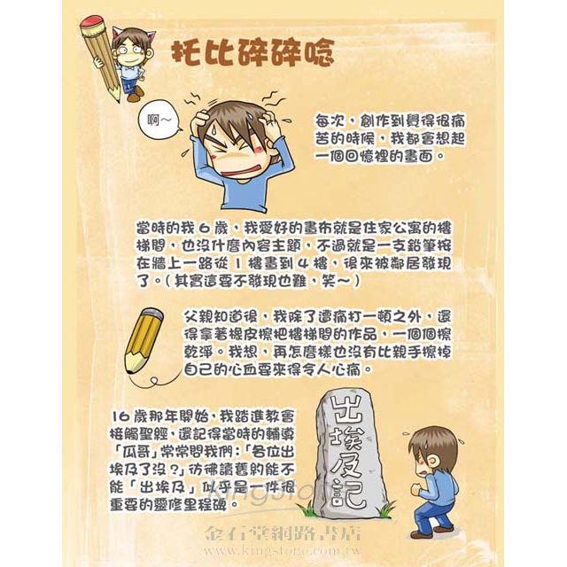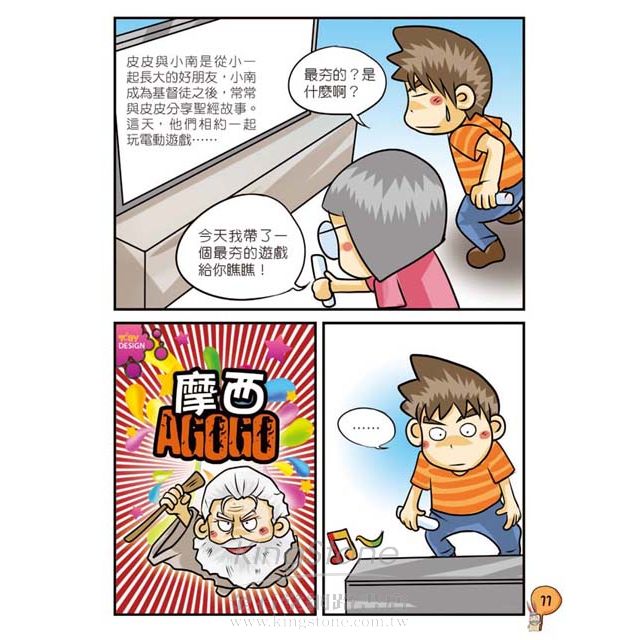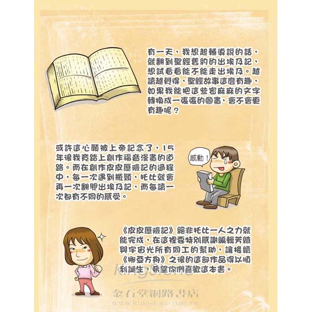 知名圖文漫畫作者「托比TOBY」,透過誇張、有趣又幽默的漫畫風格呈現「聖經」裡,記載摩西帶領以色列人出埃及的故事,讓小朋友瞭解一個民族是如何脫離被奴役的苦日子,同時也讓小朋友體悟──人在困難中若能「堅持到底」、「不屈不撓」,將會產生如何截然不同的結果,希望藉此書鼓勵小朋友勇敢面對困難與挑戰。