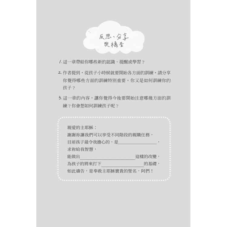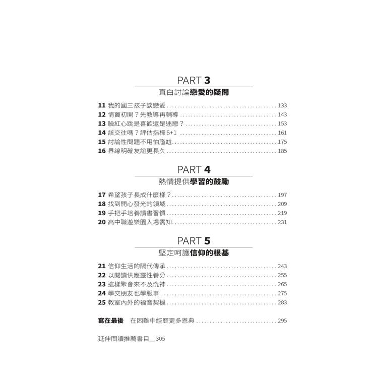 我想,書中提到的許多面向,不僅實用,能回應在地家長的需求,也能讓有學齡子女、青少年或準青少年子女的父母(及輔導),得著親切的屬靈前輩在旁手把手地給予教養建議,以及可依循的榜樣。