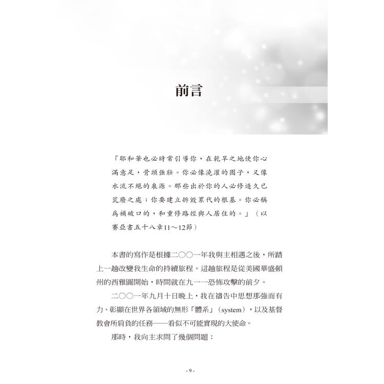 二○○一年九月十日晚上,我在禱告中思想那強而有力、彰顯在世界各領域的無形「體系」(system),以及基督教會所肩負的任務─看似不可能實現的大使命。