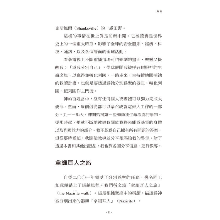 自從二○○一年領受了分別為聖的任務,幾名同工和我便踏上了這趟旅程。我們稱之為「拿細耳人之旅」(the Nazirite walk)。這是根據聖經中的稱謂,描述為神被分別出來的器皿「拿細耳人」(Nazirite)。