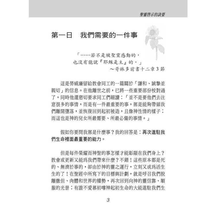 「但是每件榮耀而神聖的事怎樣彰顯在我們身上!教會或更新能為我們帶來什麼?這些原本是死的,無助於事,由於神的靈的運行,立刻又是活生生的了!在聖經內所寫下的目標和計劃,就是呼召我們脫離撒但、肉體、和世界的權勢,再回到向神的靈信靠順服的光景。有誰不愛慕神起初生命的大能在我們裏面!在聖經內一切的仁愛和喜樂是為人所有,但在亞當裏的墮性無法使我們變的,只有靠神來感動,將祂的生命和性情放置在我們裏面,才能使我們有神聖的愛心。假如「若不是聖靈感動就無人認耶穌」的真理是不改變的真理,那除非是聖靈的引導或管理,我們也無法有基督的性情和神聖的大能。