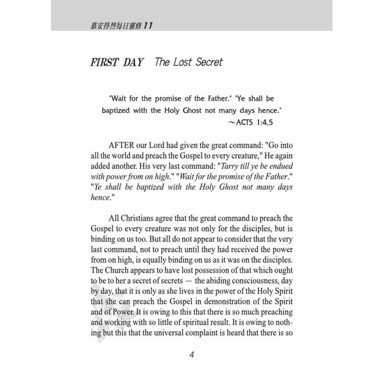 基督徒大概都同意到普天傳福音的大使命,不僅交給了門徒也交給了我們,但卻不考慮等候上頭來能力,與最後的命令,同樣不僅給予門徒也給予我們,教會沒有支取這應有訣要中的訣要,每天內住在聖靈裏,也只有如此活在聖靈能力裏,當傳福音時才會帶著聖靈的大能。如此多的傳講和事工,只有這麼小的結果,其最普遍的原因就是禱告太少,尤其是從上頭來能力有功效的禱告太少。