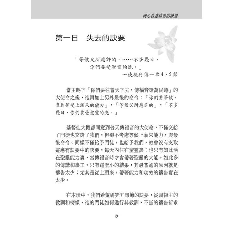 在這本小冊之中我們希望研究五旬節的訣要,從賜福主的教訓和榜樣,祂的門徒如何遵行其教訓,不斷的禱告祈求直到被聖靈充滿的應許成就,神的大能藉他們而被證明。