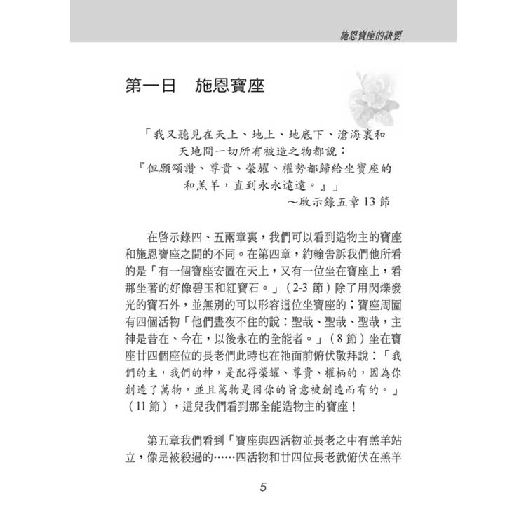 今天我們看到施恩寶座以及神和羔羊的寶座,也聽到由天堂詩班唱出施恩寶座以及神和羔羊的頌歌,我的靈魂啊!當你靠近施恩寶座時,你曾想過耶穌為了設此寶座付出了何等大的代價,當你需要的時候你也確知可從寶座支取恩典和幫助,故你當俯伏敬拜!親愛的讀者:請你今天抽點時間來到主為我們贖罪而設立的施恩寶座前來,向天父禱告,用最敬虔的心靈向在施恩寶座上的主耶穌基督敬拜。