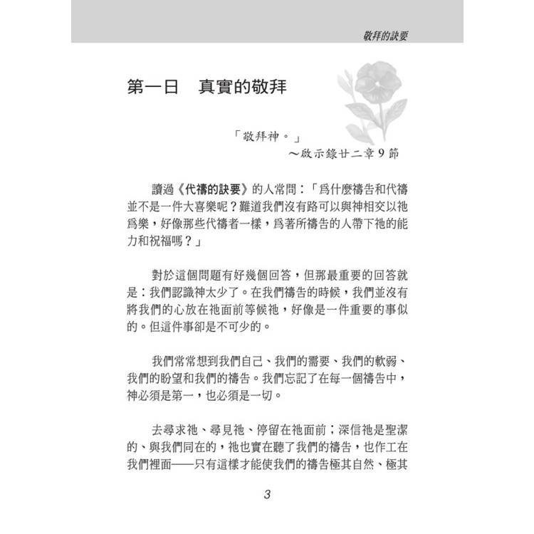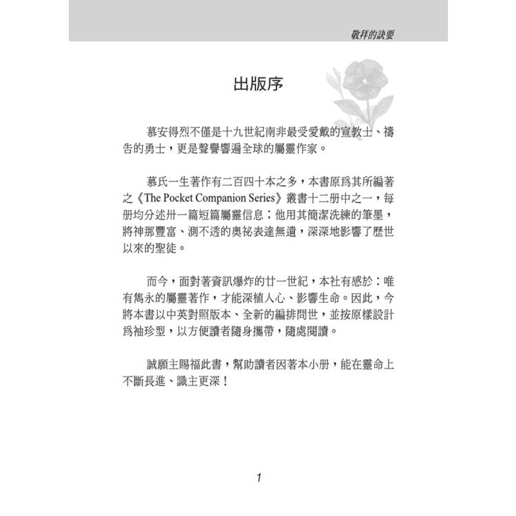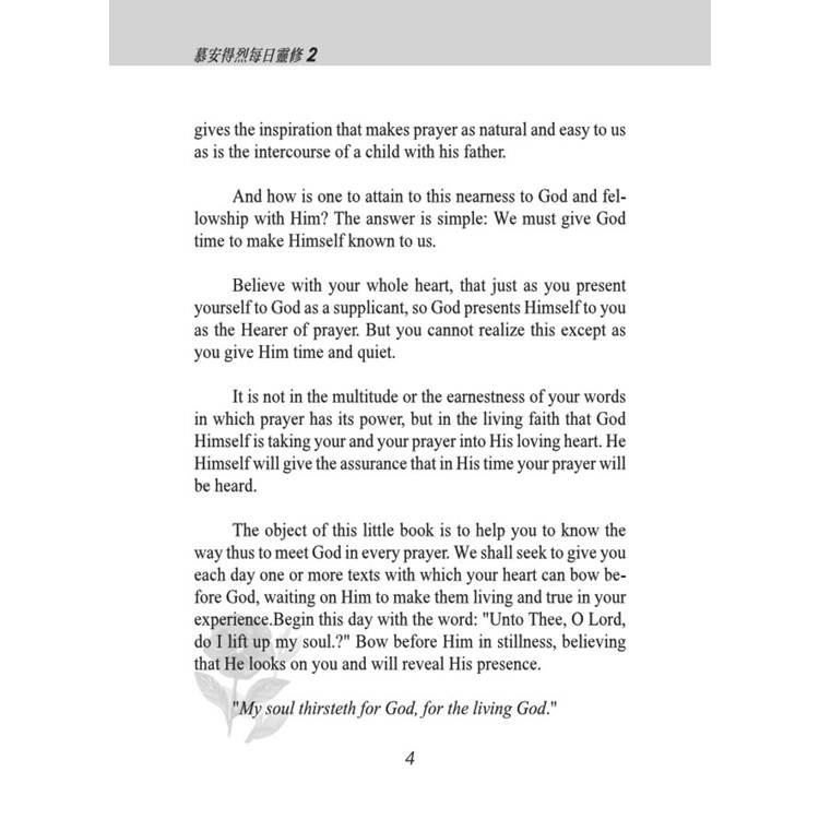 本書的用意是要幫助你,在每一個禱告裏去認識那一條遇見神的路。我們每天要給你一些話語,使你藉著這些話叫你的心能俯伏在神面前等候他,使這些話又真又活地成為你的經歷。