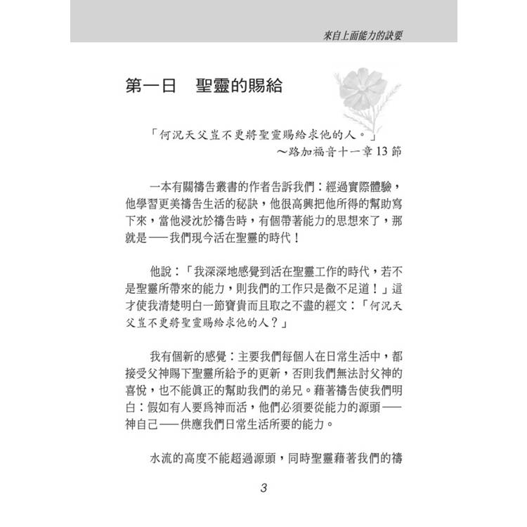 一本有關禱告小冊子的作者告訴我們:經過實際體驗,他學習更美禱告生活的秘訣,他很高興把他所得的幫助寫下來,當他沉浸於禱告時,有個帶著能力的思想來了,那就是我們現今活在聖靈的時代!他說:「我深深地感覺到活在聖靈工作的時代,若不是聖靈所帶來的能力,則我們的工作只是微不足道!這才使我清楚明白一節寶貴而且取之不盡的經文,「何況天父豈不更將聖靈賜給求祂的人。」