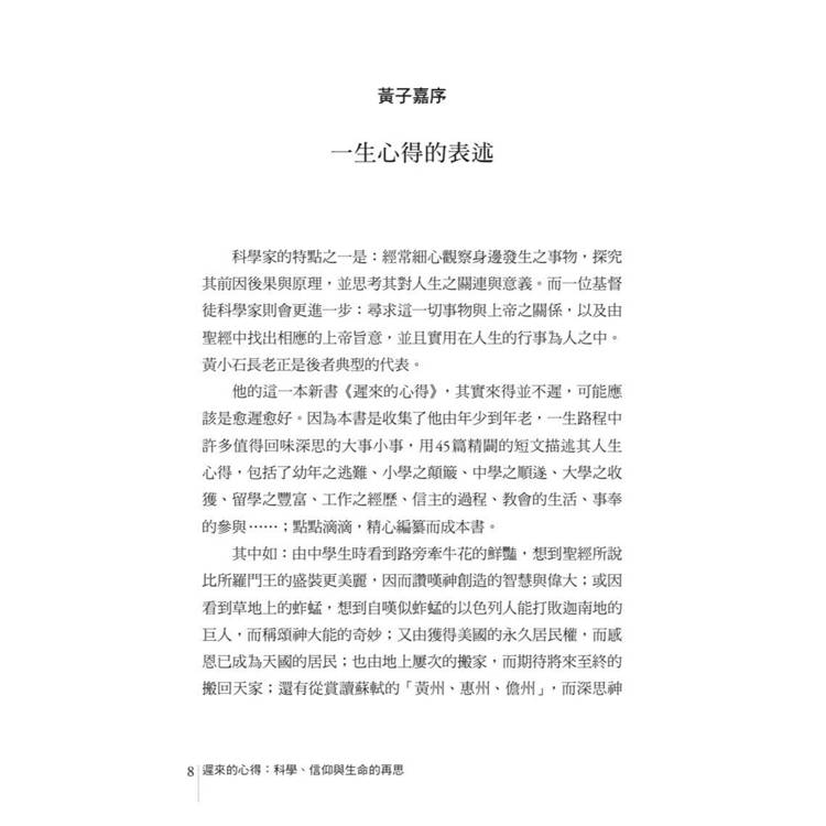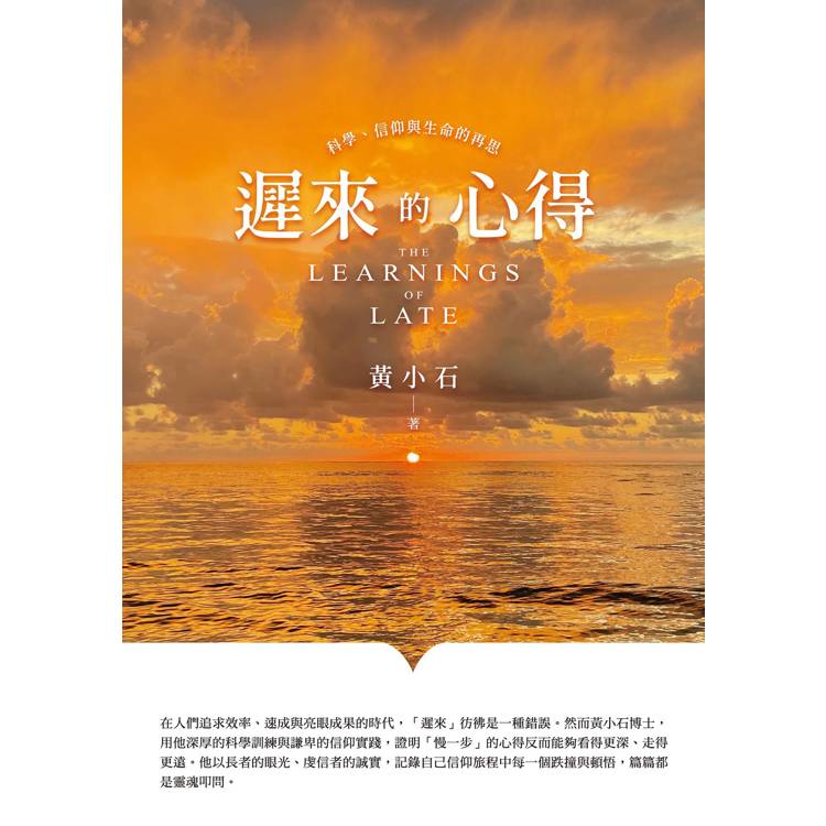在人們追求效率、速成與亮眼成果的時代,「遲來」彷佛是一種錯誤。然而黃小石博士,用他深厚的科學訓練與謙卑的信仰實踐,證明「慢一步」的心得反而能夠看得更深、走得更遠。他以長者的眼光、虔信者的誠實,記錄自己信仰旅程中每一個跌撞與頓悟,篇篇都是靈魂叩問。