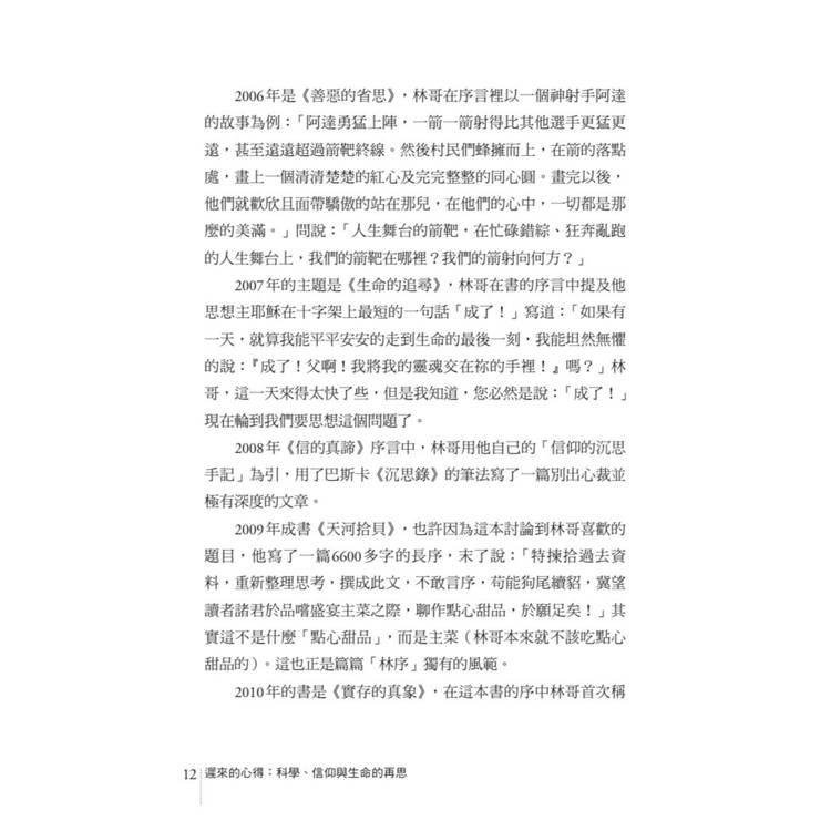 2008年《信的真諦》序言中,林哥用他自己的「信仰的沉思手記」為引,用了巴斯卡《沉思錄》的筆法寫了一篇別出心裁並極有深度的文章。