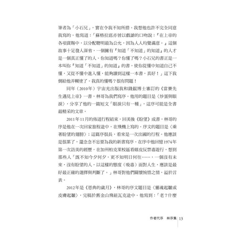 別人的序多是要在讀本文之前讀的,但林哥的序是可以在讀完本文之後讀的。早知如此,在我寫書之前,就應該先請林哥寫序,然後我再動筆,內容一定更完整,可惜不再有機會了。可惜!可惜!有人問我會再出書嗎?可是「林序」呢?