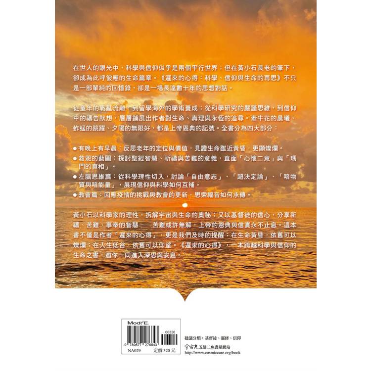 從童年的戰亂流離,到留學海外的學術養成;從科學研究的嚴謹思維,到信仰中的禱告默想,層層鋪展出作者對生命、真理與永恆的追尋。牽牛花的晨曦、蚱蜢的跳躍、夕陽的無限好,都是上帝恩典的印記。全書分為四大部分: