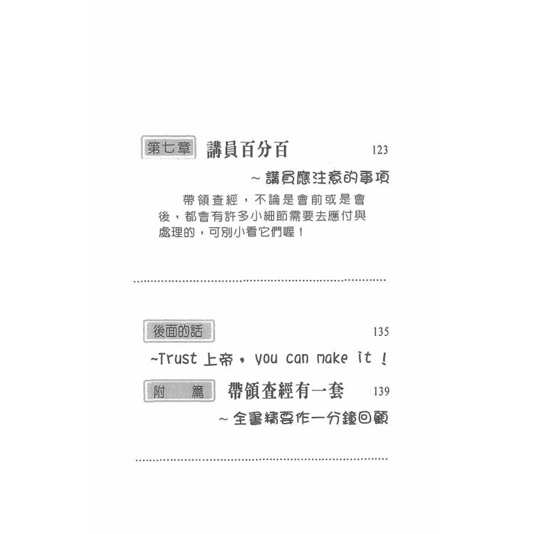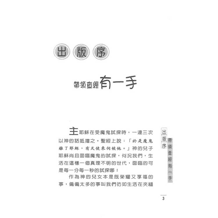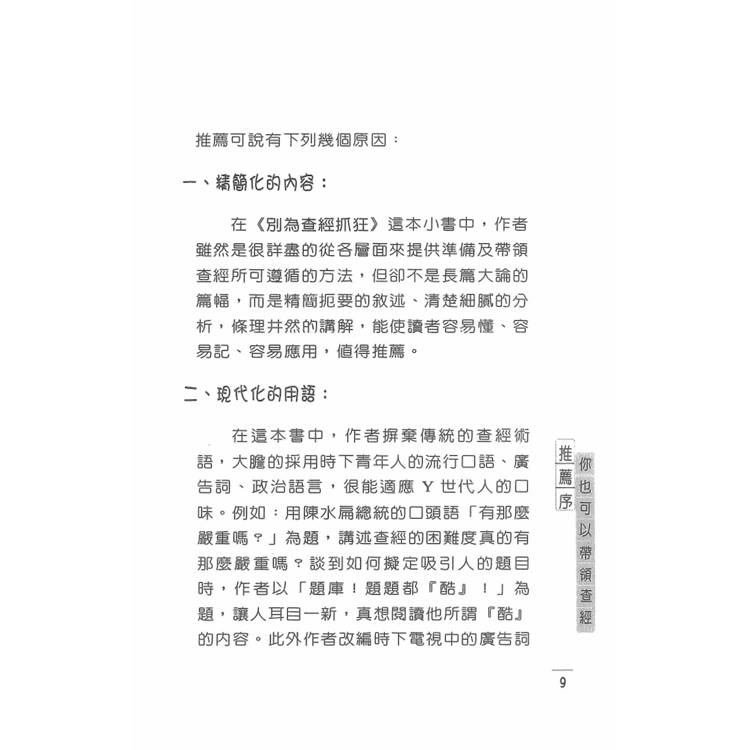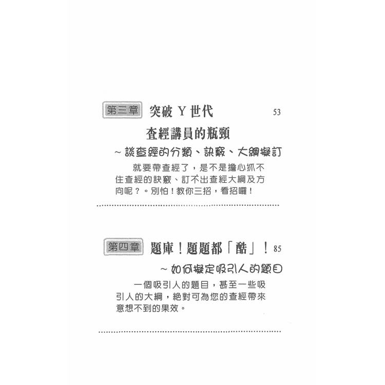 查經,絕對「沒有那麼嚴重」!本書將查經的各項細節,訣竅逐一頗析。沒有長篇大論,沒有教條式的言詞,完全跳脫傳統的窠臼,以年輕人的立場與觀點來告訴您:您可以怎樣講解經文?如何輕鬆擬定大綱?如何拰定吸引人的題目……。