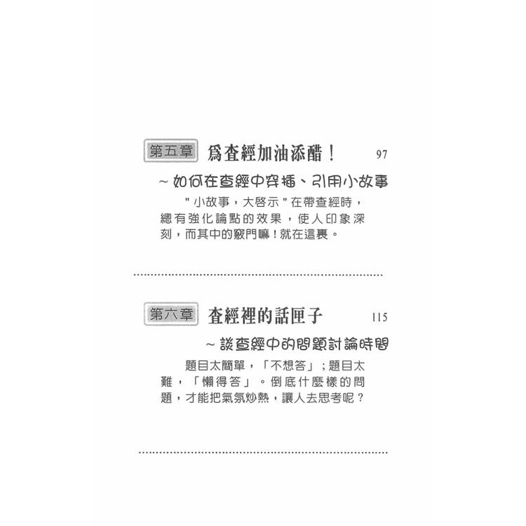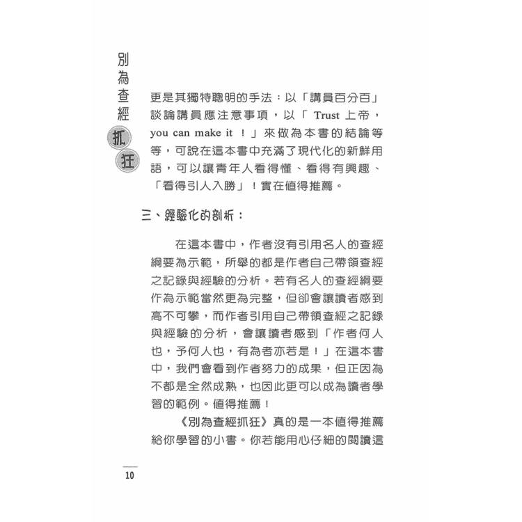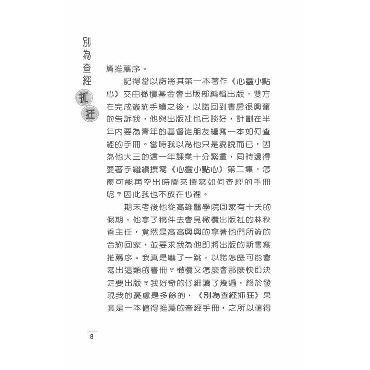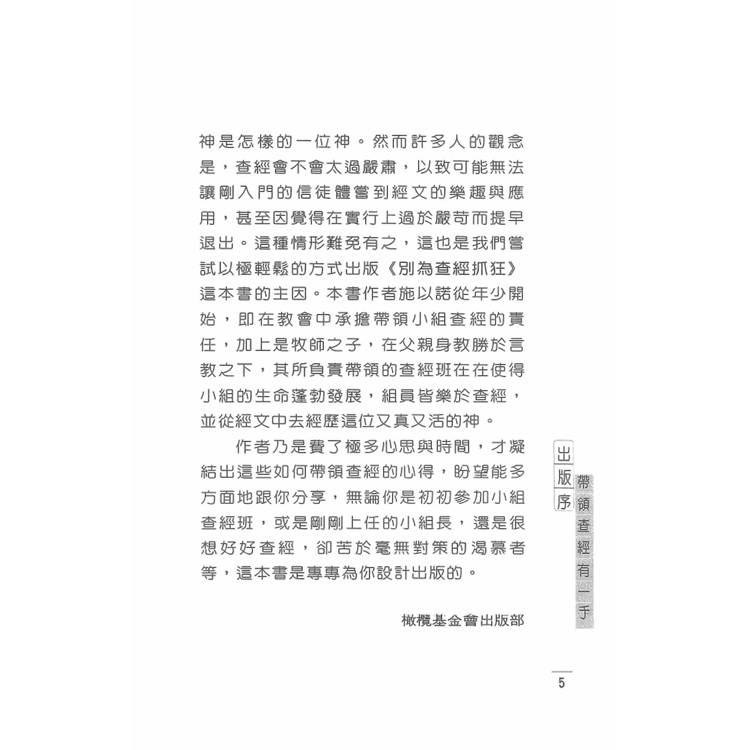 然而許多人的觀念是,查經會不會太嚴肅,以致可能無法讓剛入門的信徒體嘗到經文的樂趣與應用,勝智因覺得在實行上過於嚴苛而體早退出。這種情形難免有之,這也是我們嘗試以極輕鬆的方式出版《別位查經抓狂》這本書的主因,本書作者施以諾從年少開始,即在教會中擔任小組查經的責任,加上是牧師之子,在父親身教勝於言教之下,其所負責帶領的查經班在在,使得小組的生命成長,組員皆樂於查經,並從經文中去經歷這位又真又活的神。