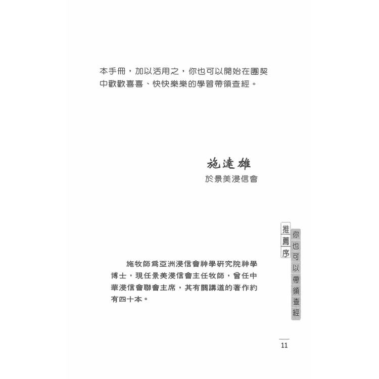 本書以精簡扼要的敘述、清楚細膩的分析、條理井然的講解,幫助我們了解帶領查經的訣竅。能使讀者更容易懂、容易記、容易使用,是值得推薦的一本查經手冊。